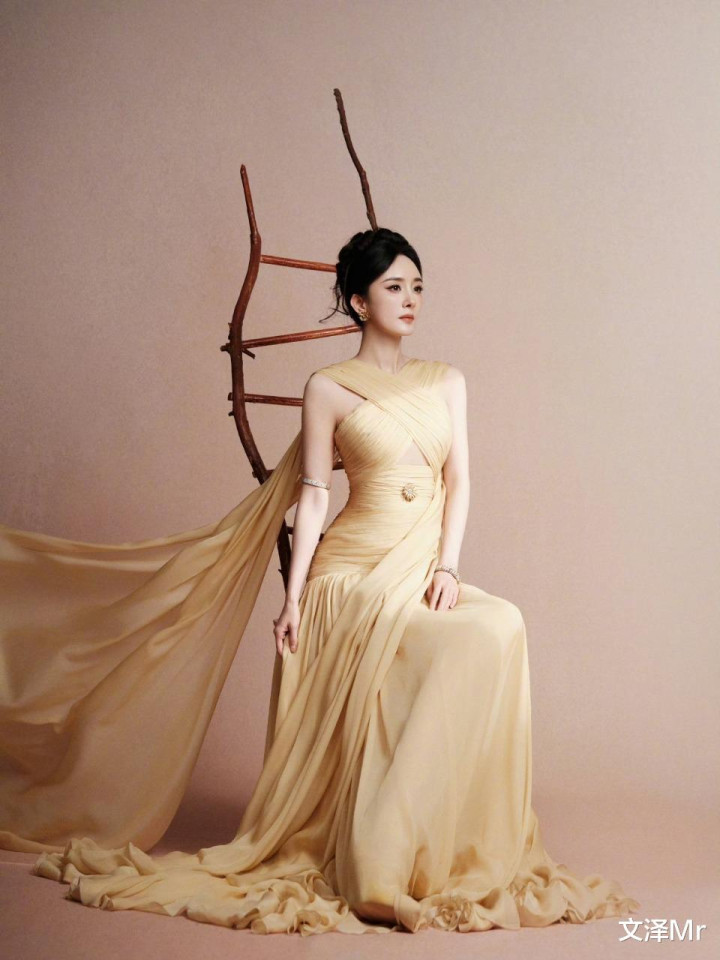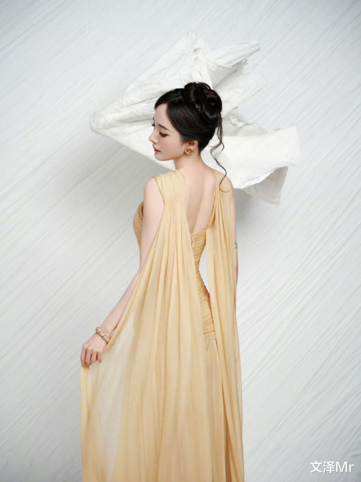 杨幂身披一袭米黄色薄纱,轻柔的纱幔如晨雾般笼在发间与肩头,仿佛从古典画卷中走出的仙子。薄纱半掩,却不减丝毫风华;朦胧之中,反而更添神秘气息。纤细的眉形,微微上扬的眼线,柔和的唇色,每一处细节都诉说着温婉而不失力量的气质美学。她的时尚哲学在这里初次展现:真正的优雅,不需要全盘托出,留白处自有想象空间。